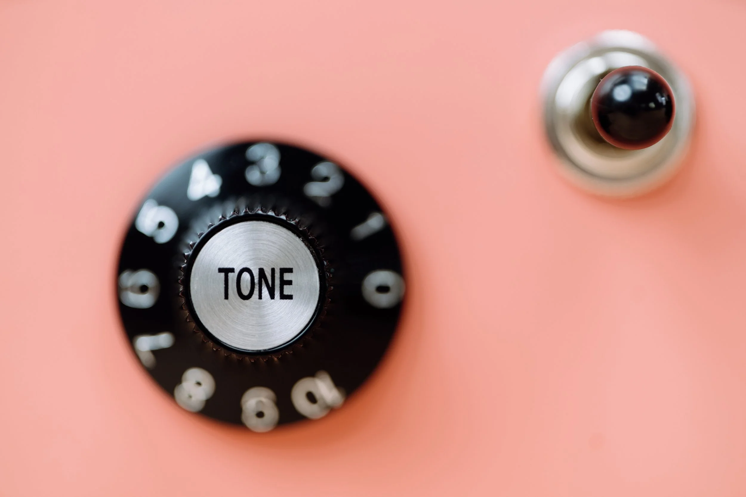Close-up of a pink electric guitar with tortoiseshell pickguard on a wooden table.