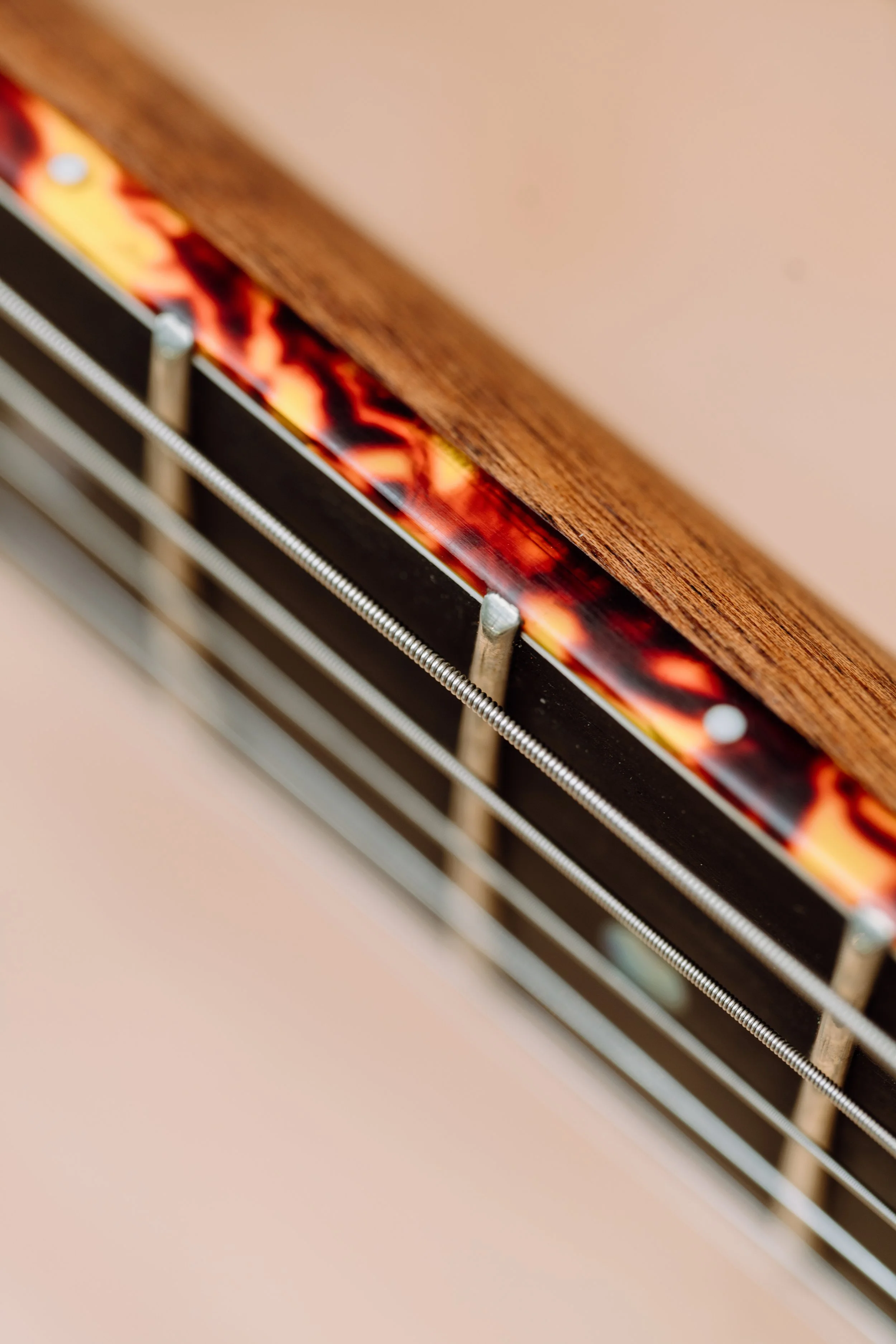 Close-up of a guitar neck showing strings and fretboard with decorative binding.