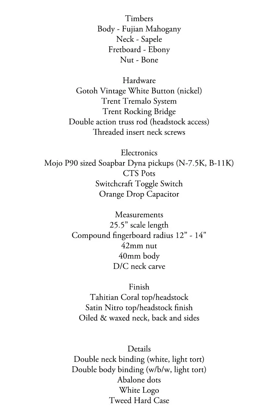 Specifications for a guitar detailing timbers, hardware, electronics, measurements, finish, and details, including materials like Fujian mahogany, sapele, ebony, and features like Mojo P90 pickups, Gotoh vintage buttons, and Satin Nitro finish.