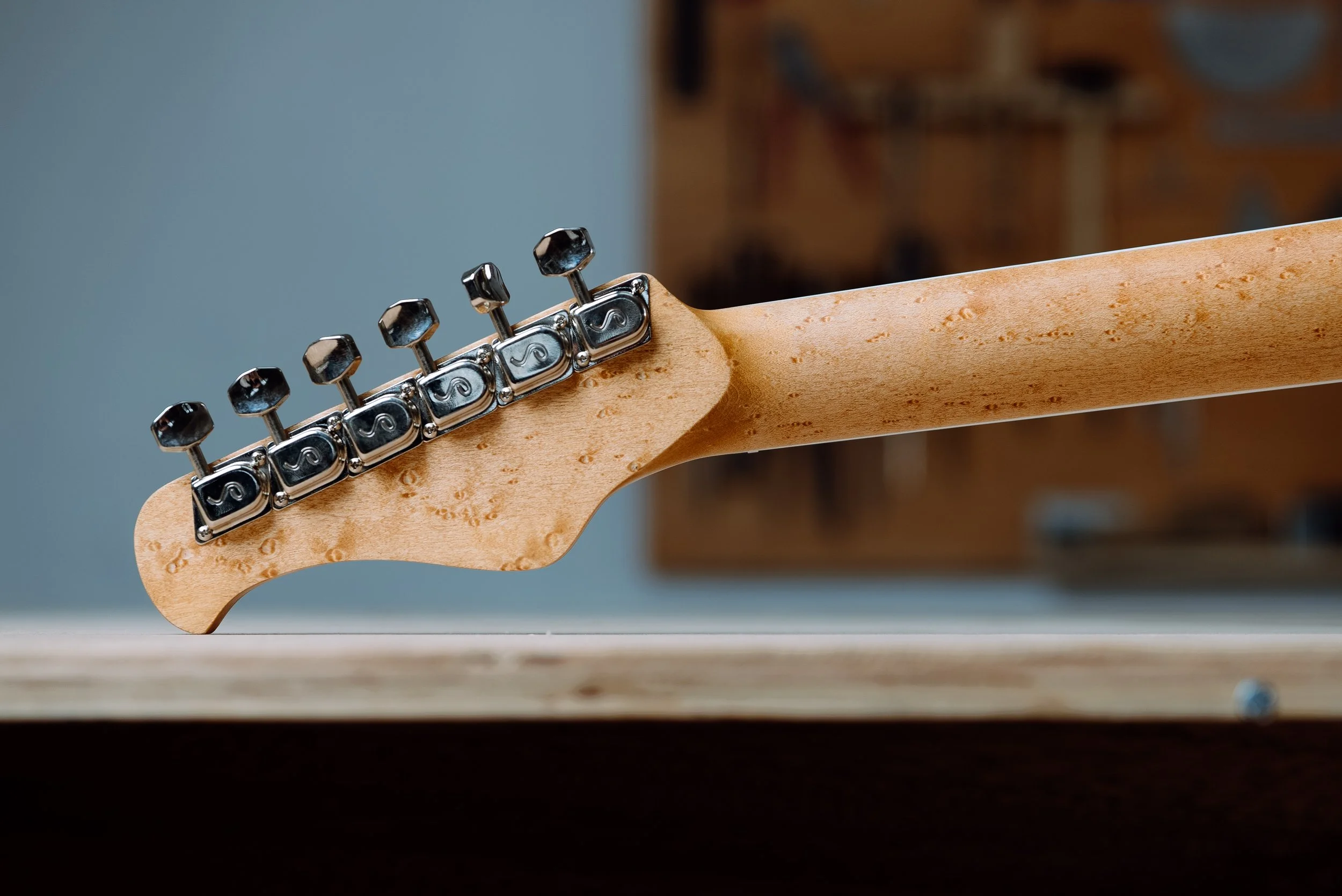 Guitar neck with tuning pegs on wooden surface