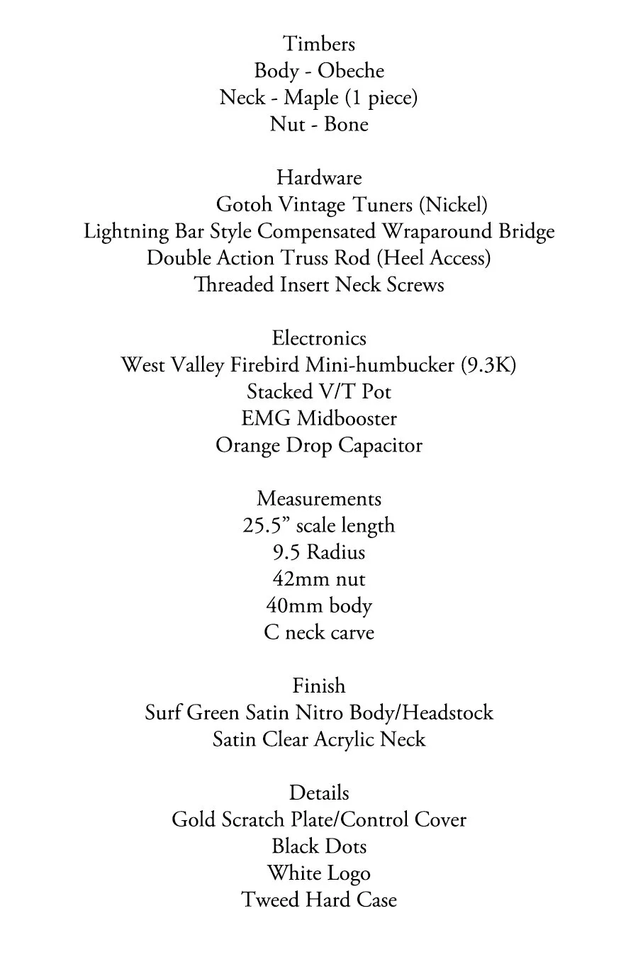 Description of a guitar featuring specifics on timbers, hardware, electronics, measurements, finish, and additional details. Includes obeche body, maple neck, Gotoh vintage tuners, mini-humbucker, and nitro body finish.