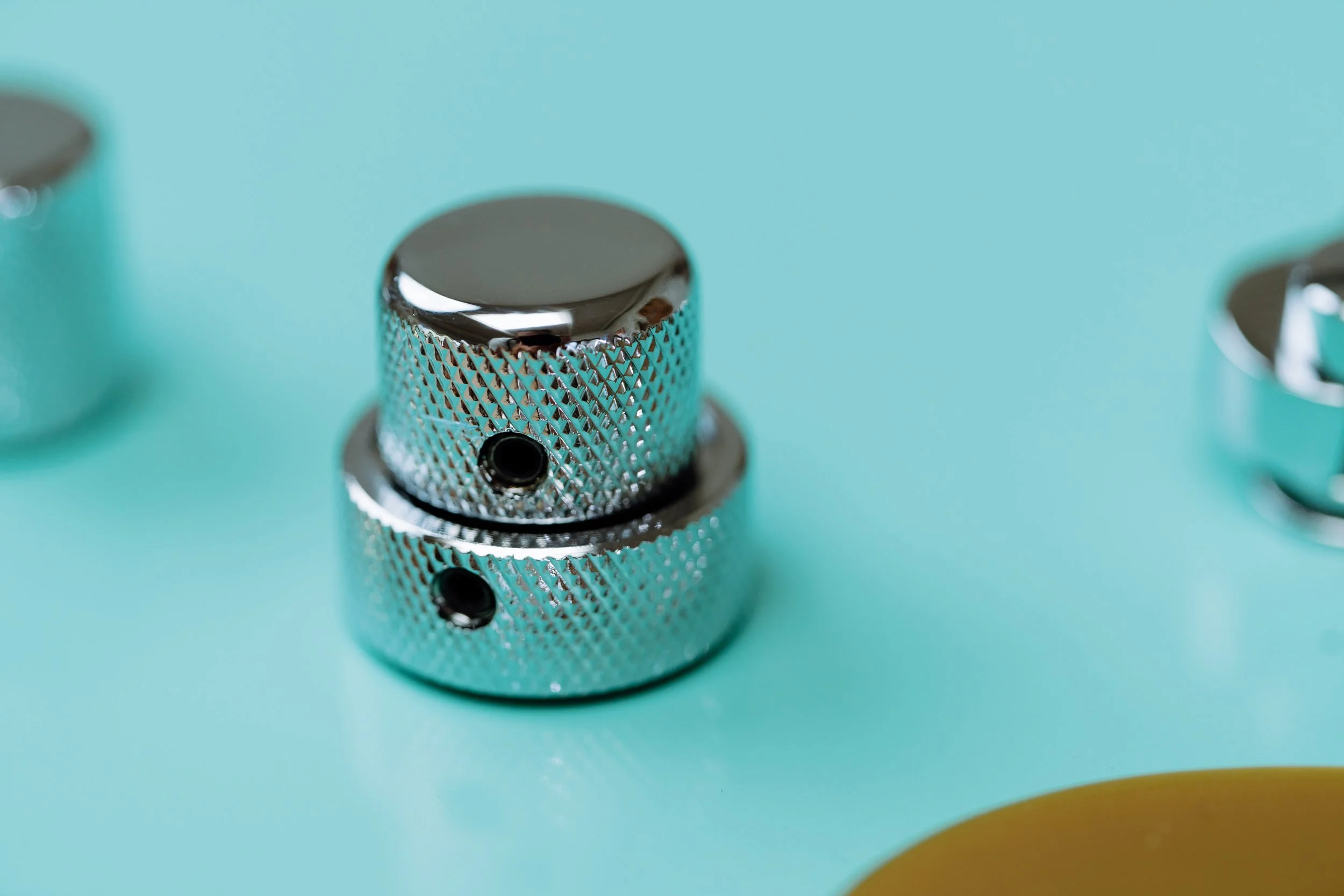 Close-up of a metallic guitar knob with knurled texture on a turquoise background.