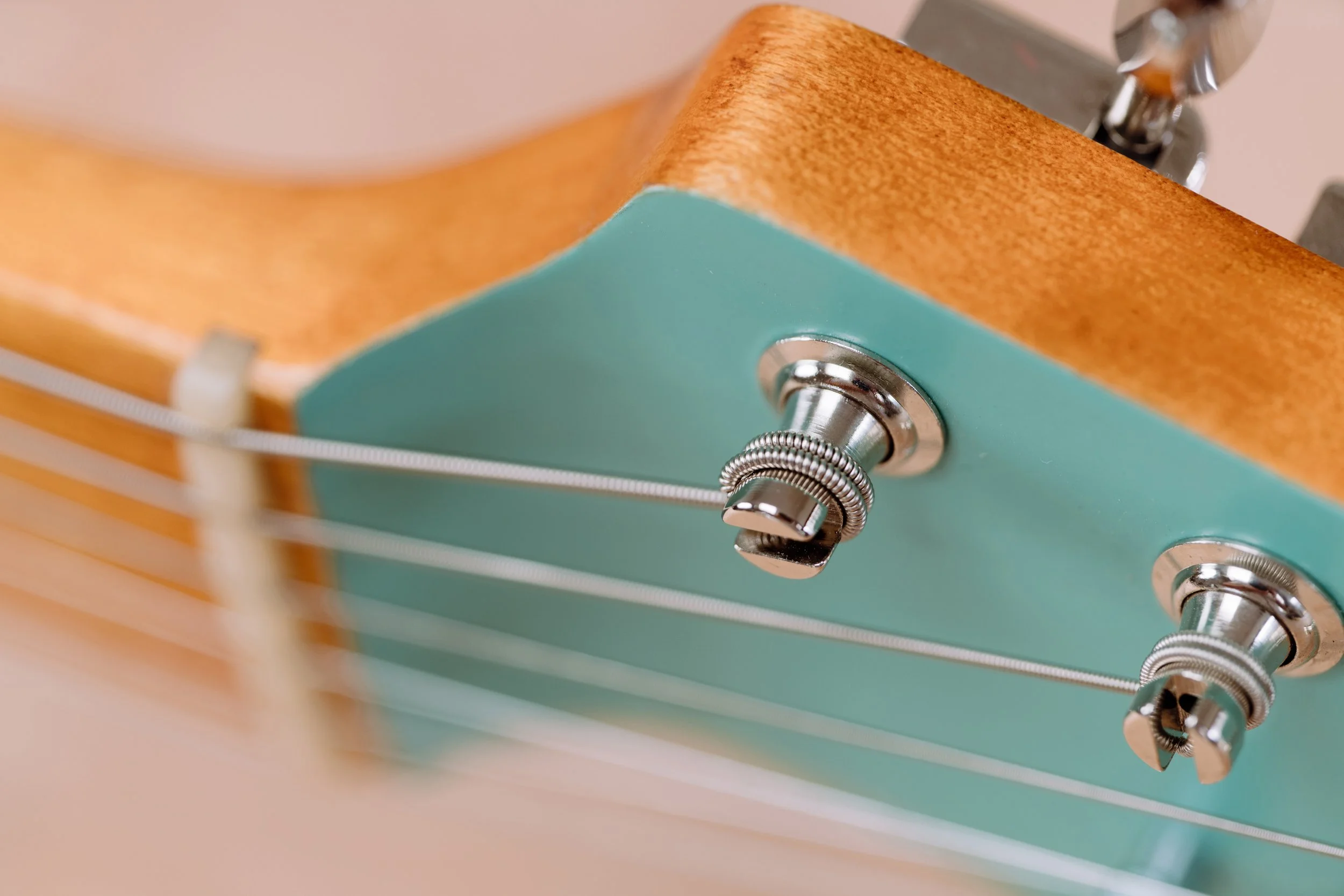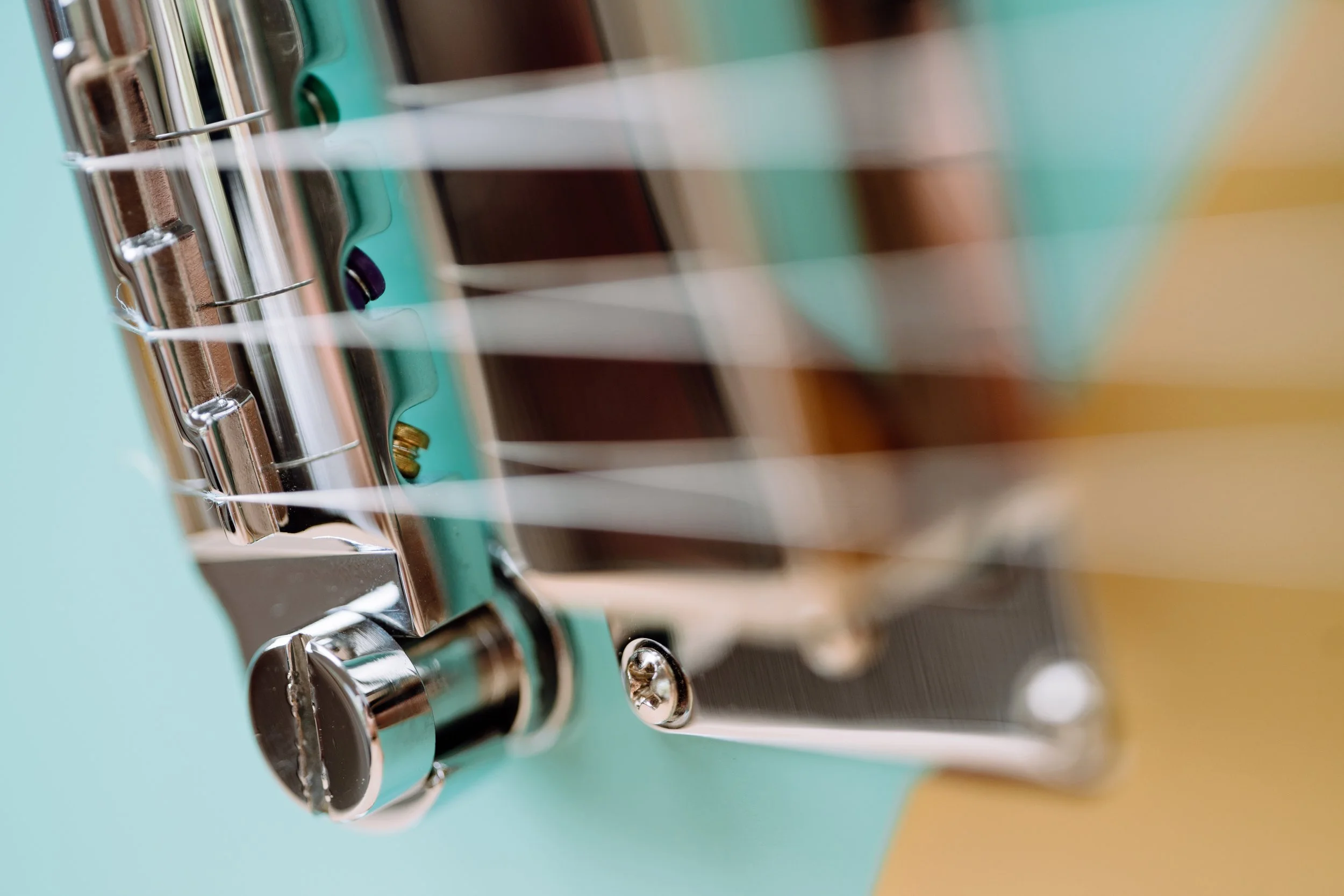Close-up of a turquoise electric guitar showing strings, fretboard, and golden pickguard.