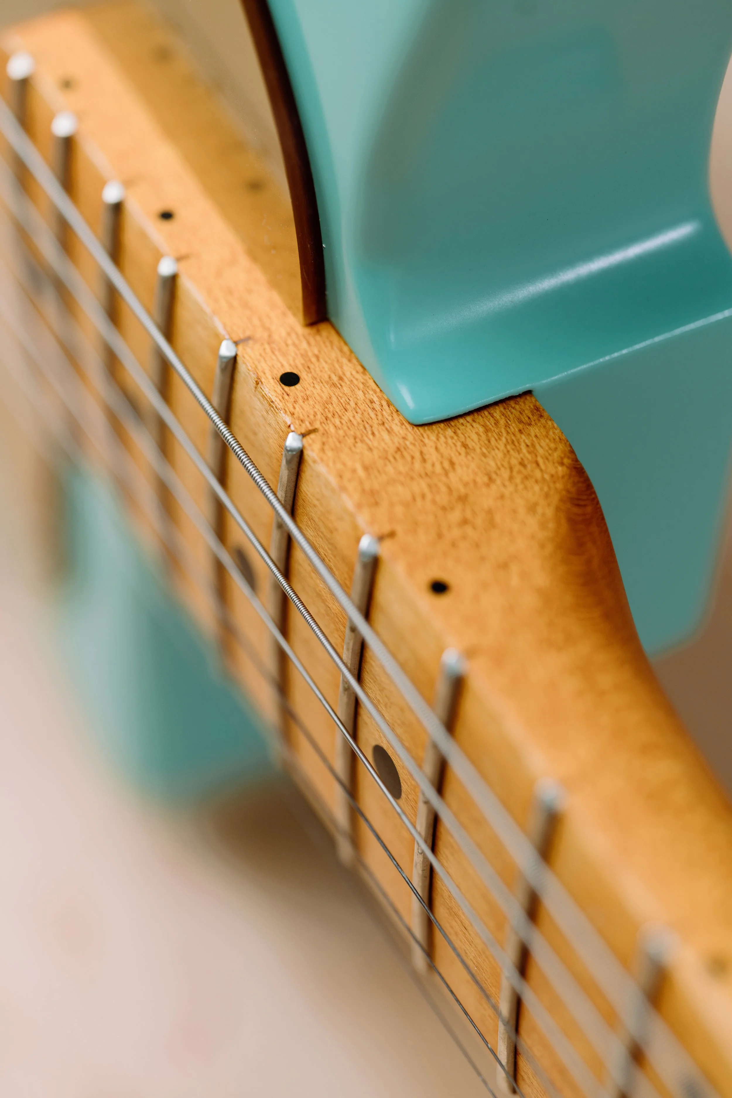 Turquoise electric guitar with gold pickguard and maple neck resting on a wooden surface.