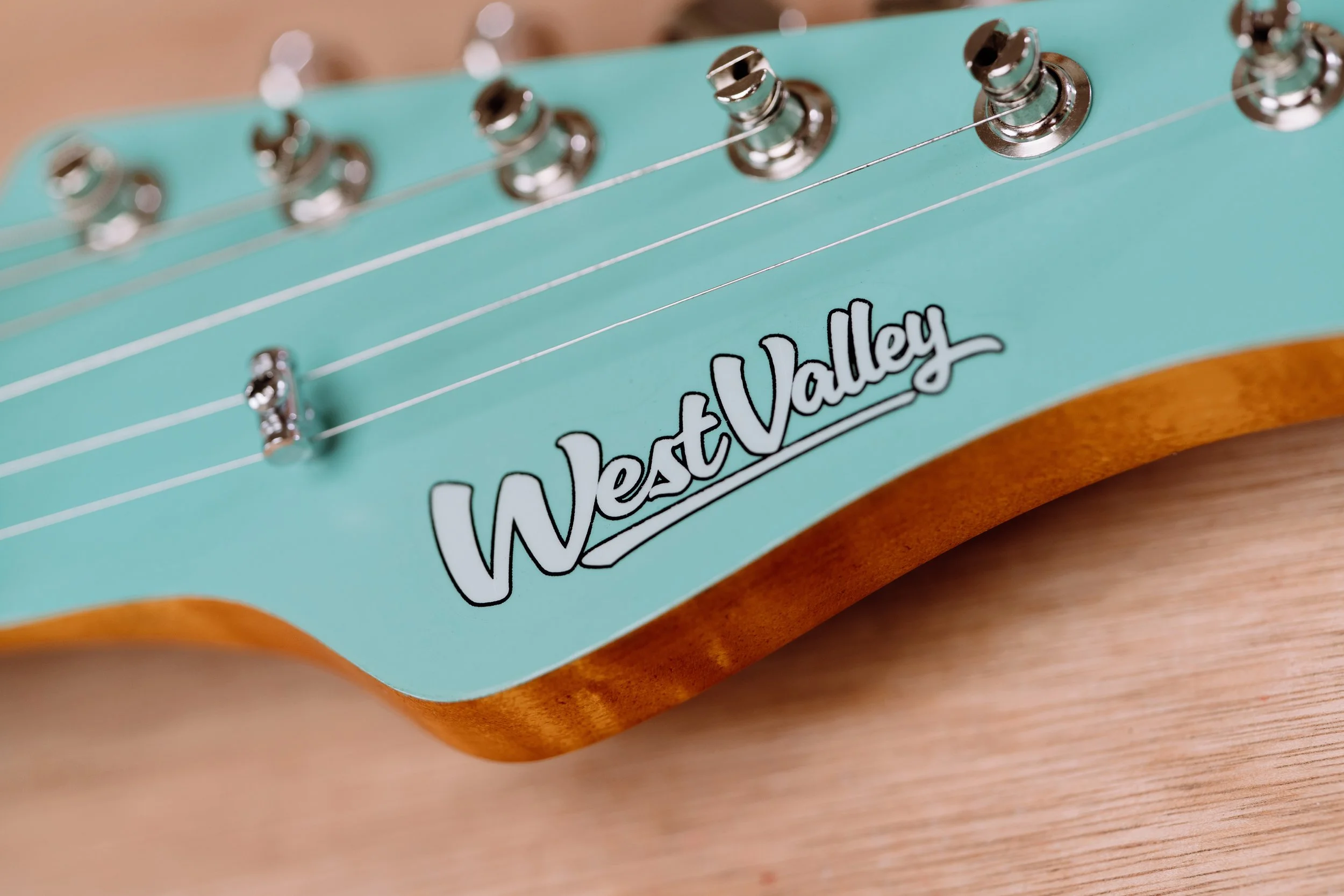 Close-up of a guitar headstock with "West Valley" logo, turquoise color, six tuning pegs, and wooden neck with visible frets.